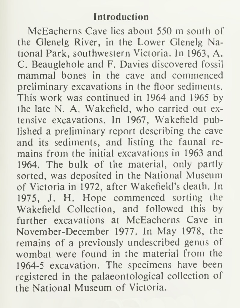 4. Hope, J H; Wilkinson, H E. “Warendja wakefieldi, a new genus of wombat (Maruspialia , Vombatidae) from Pleistocene sediments in McEacherns Cave, western Victoria”. https://museumsvictoria.com.au/media/5136/jmmv19824308.pdf