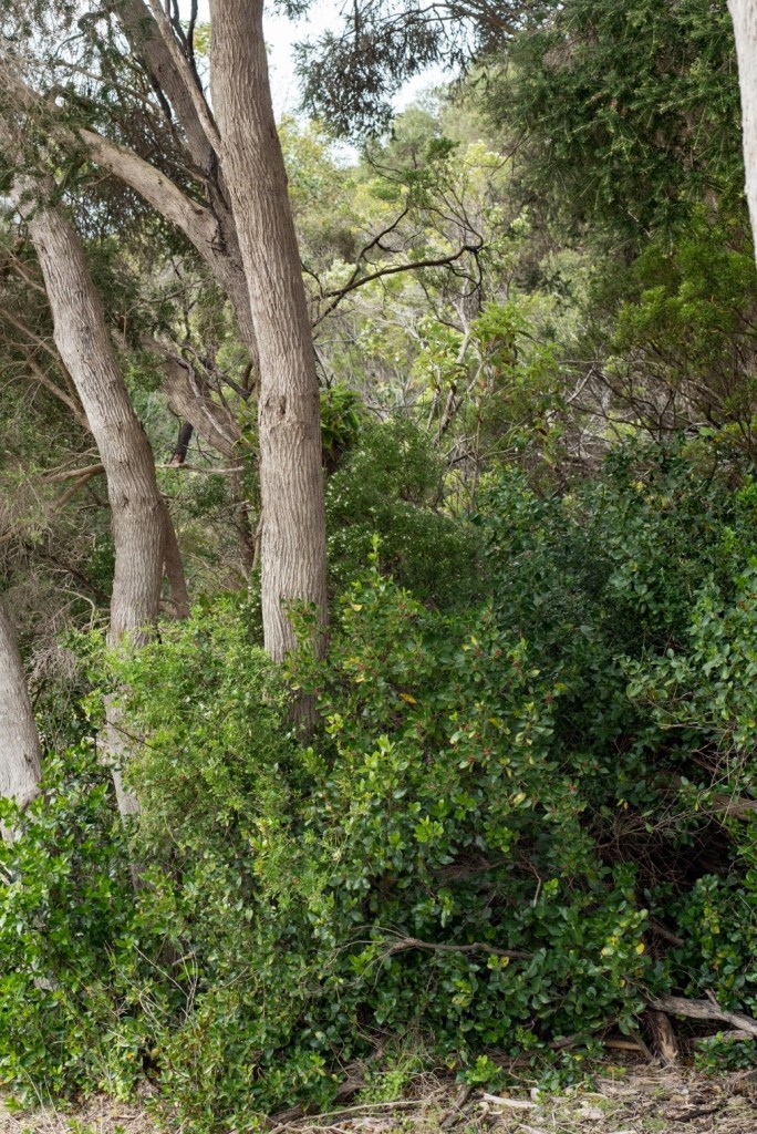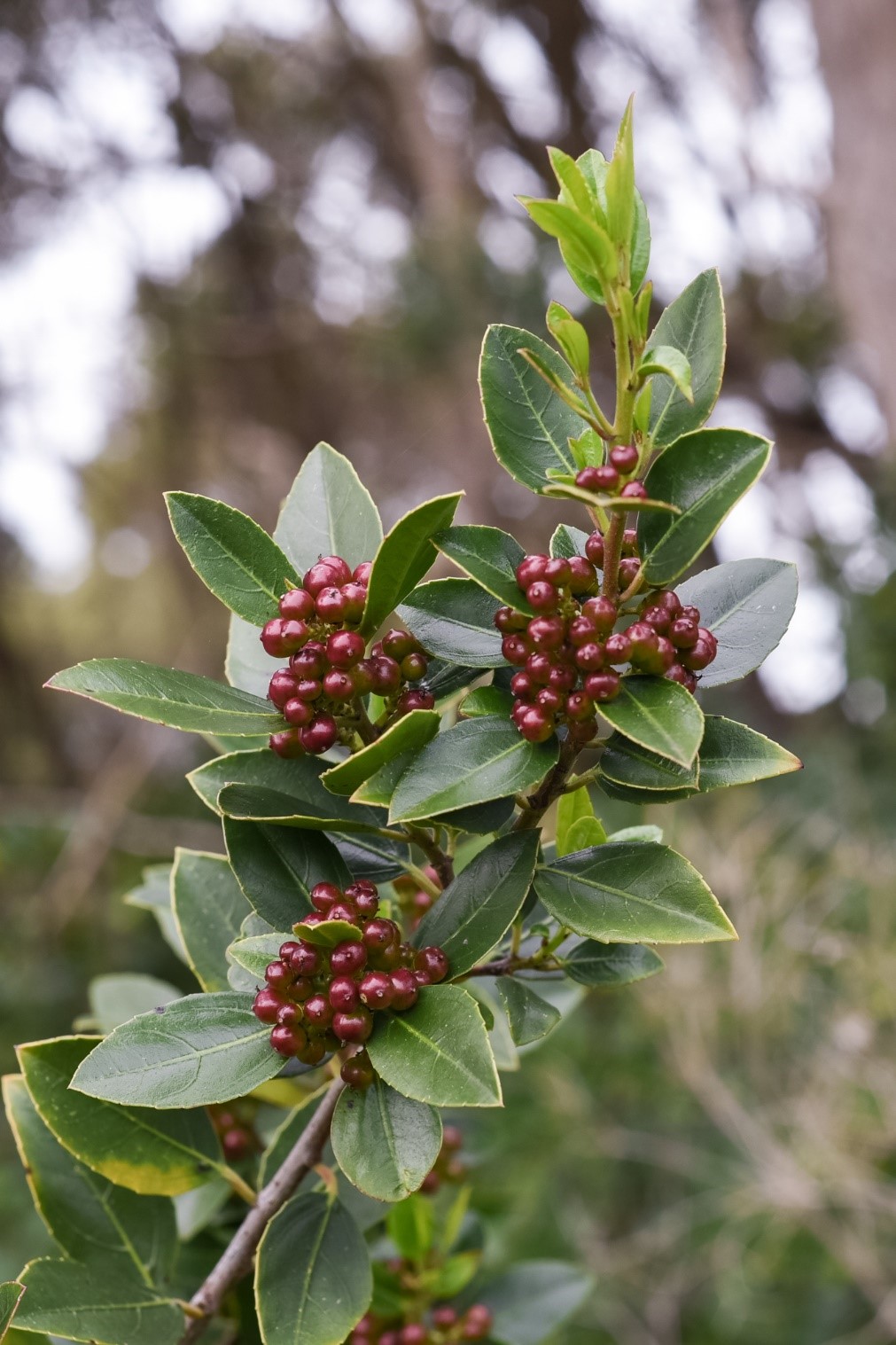Dense shrub to 3m plus high. Dark glossy green leaves 2-8cm long with serrated edges (a similar native, Sea Box, has smooth leaf edges). Smooth bark. Small yellow green flowers late Autumn to Spring produce small red berries in summer that ripen to black.(1) No thorns.