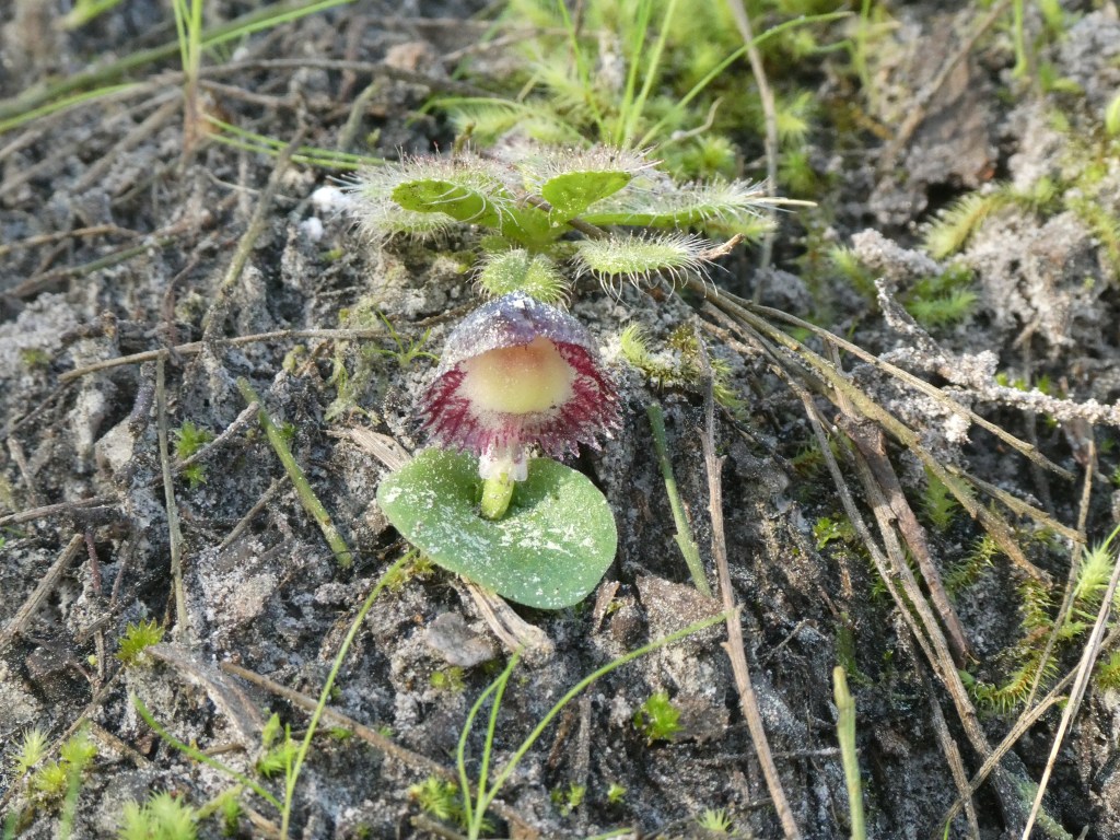 Stately or Veined Helmet-Orchid (Corybas diemenicus). There is a Sundew next to it.