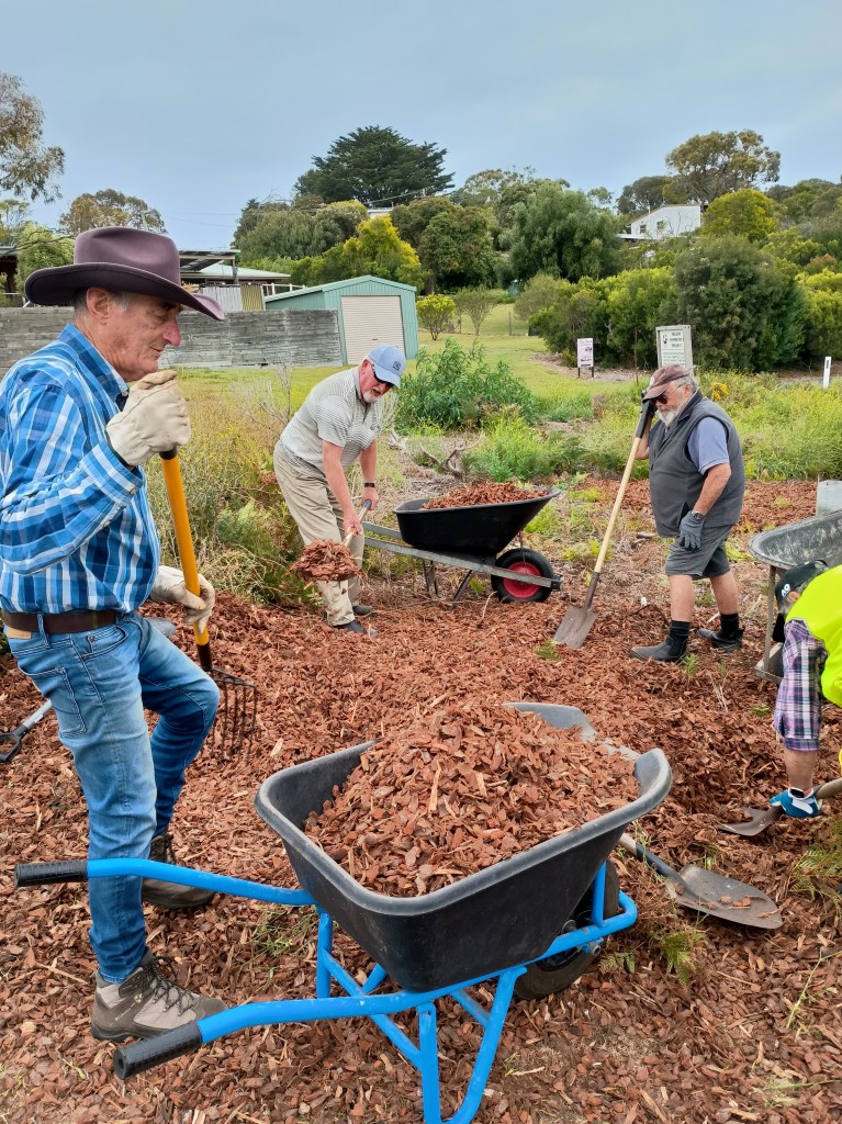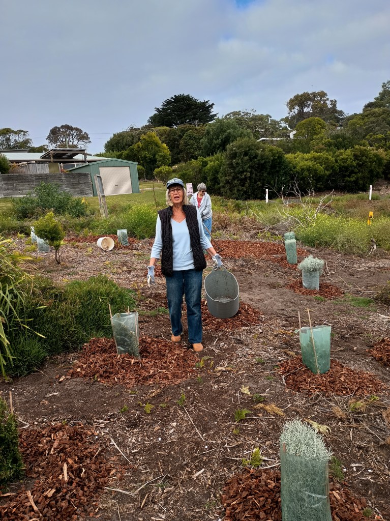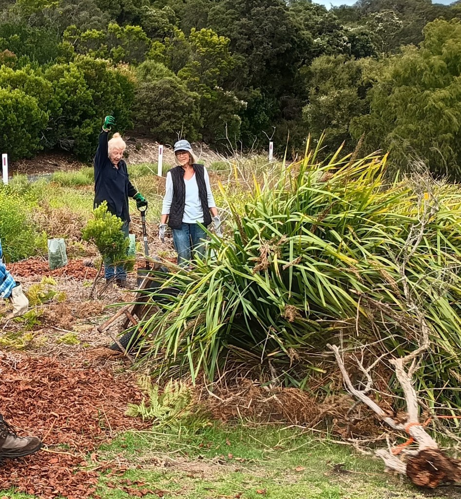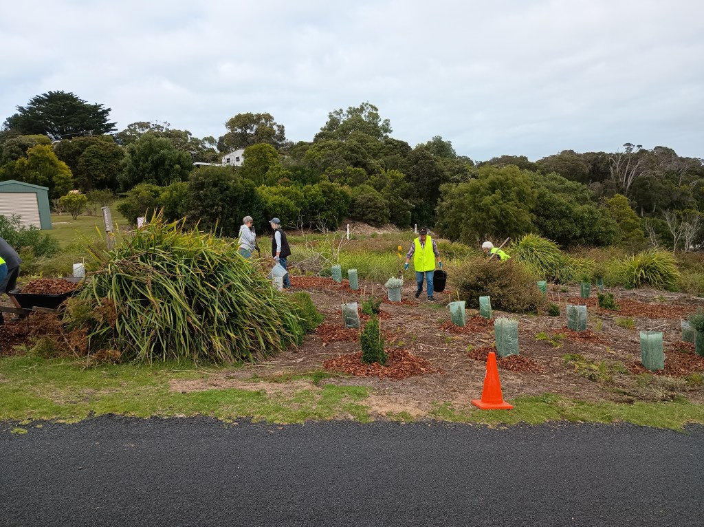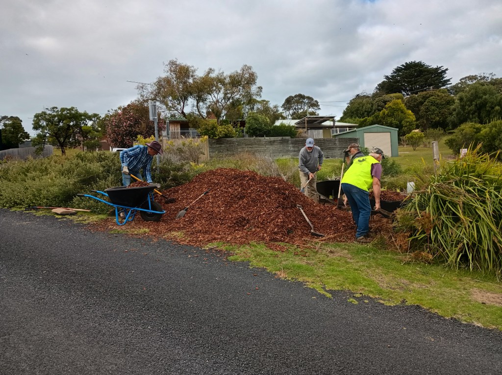 The pile of mulch looked daunting before we started. In the end, it only took eleven of us an hour to spread it out around last years’ plantings. Thanks to Fraser and the Committee of Management for organising the mulch.
